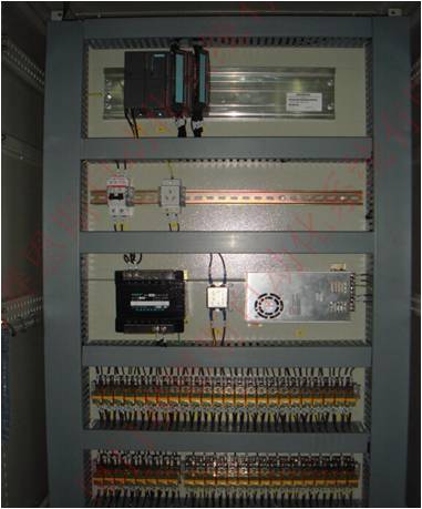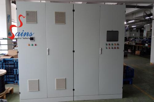 Sains designed and produced the control system. The system consists of a SIEMENS S7-300 PLC, a SIEMENS MP377 touching screen, Danfoss converters and Schneider low voltage electrical devices to control 2 ZUW400A5 water chillers, 3 37kw freezing pumps, 3 55kw processing pumps, one 15kw air conditioning pumps, 3 22kw high temperature tower pumps, and 2 groups of 11kw cooling tower.